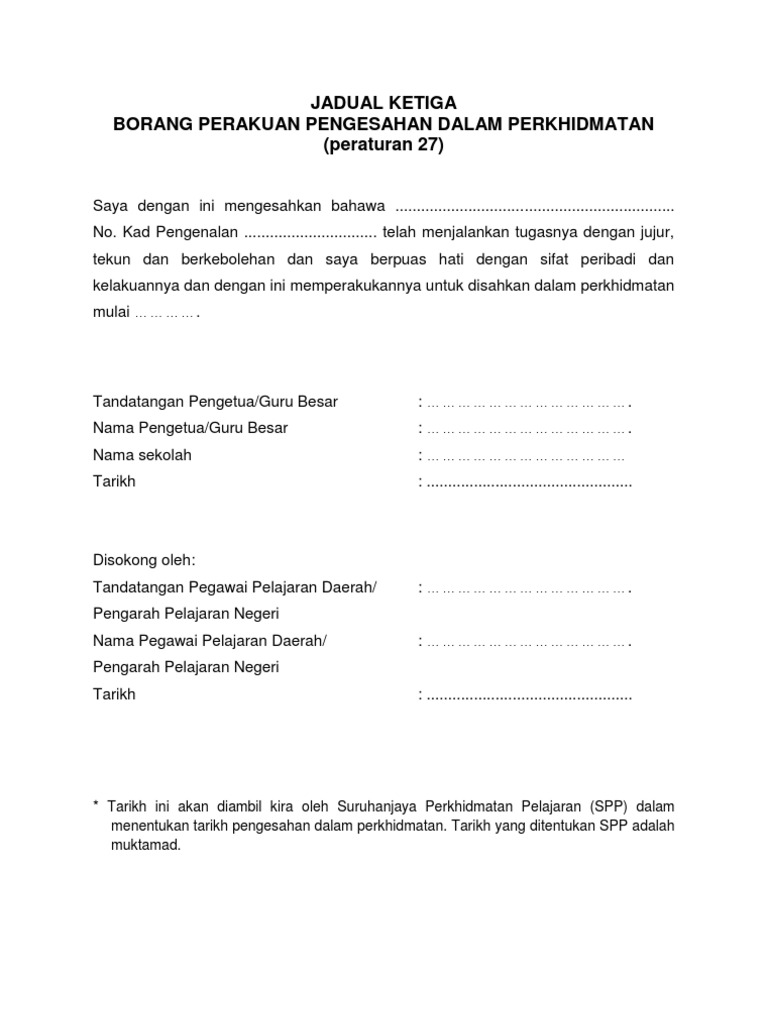 Setiap pegawai yang dilantik dikehendaki berkhidmat dalam tempoh percubaan. Untuk makluman, peperiksaan perkhidmatan awam ada beberapa jenis iaitu kenaikan pangkat, pengesahan dalam perkhidmatan baca juga : Latihan dalam perkhidmatan 2020 anjuran pusat latihan pertanian (atc) timbang menggaris kota belud. Salinan sijil kursus induksi atau sijil peperiksaan perkhidmatan Halaman pengesahan dalam penulisan makalah, karya tulis, skirpsi, dll.